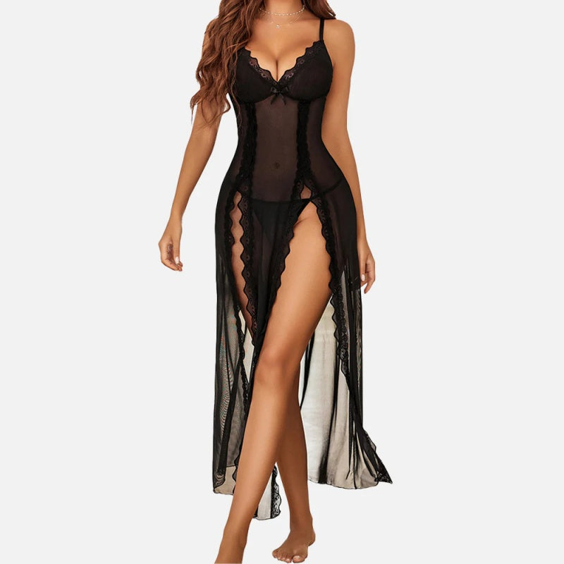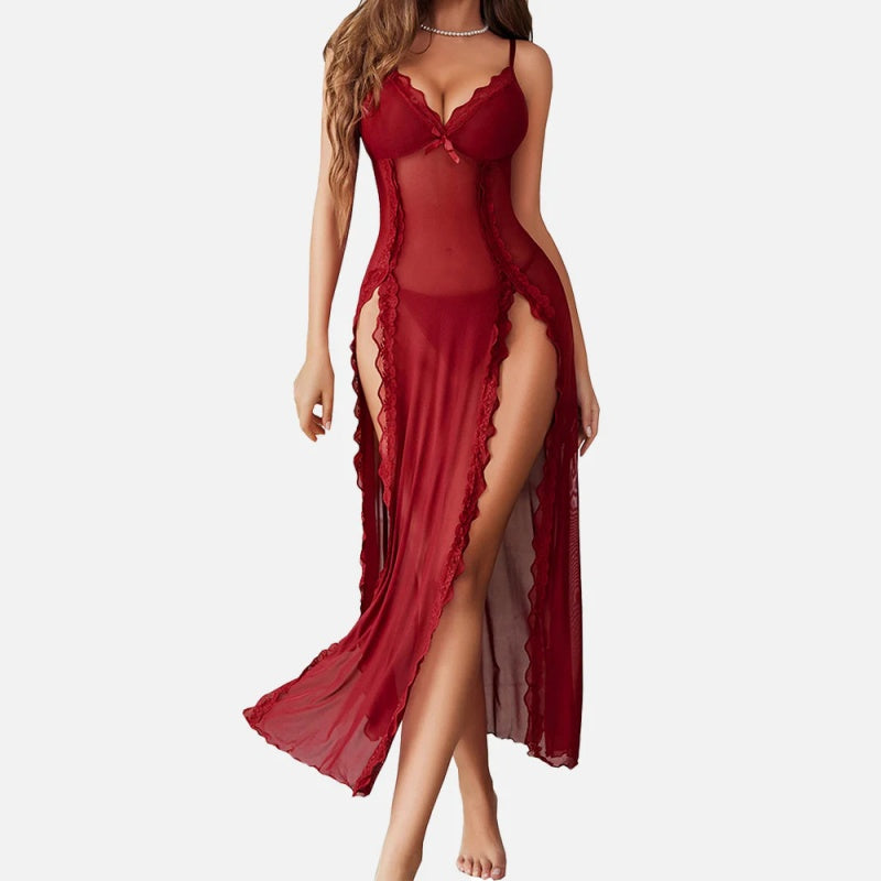Sheer Lace V-Neck Side-Split Long Nightgown