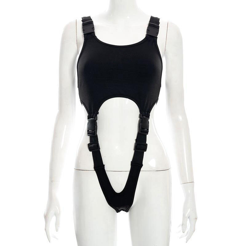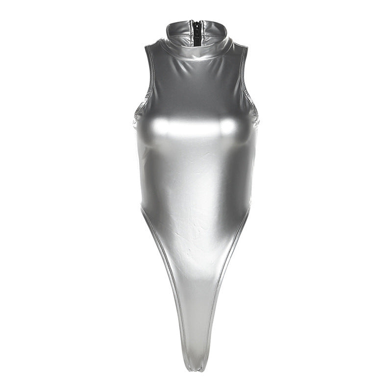 Glossy Faux Leather Lace-Up Mesh Panel Bodysuit