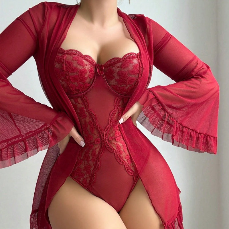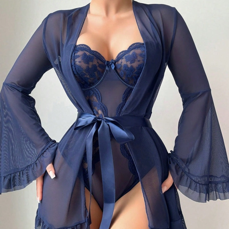 Midnight Allure Lace Sheer Slit Lingerie Nightdress Set