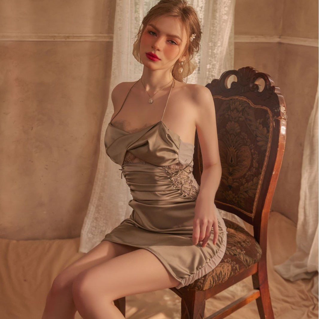Elevate your allure with this satin lace - trimmed drawstring ruched bodycon mini dress. The luxurious satin fabric glides over your curves. while the delicate lace detailing and adjustable drawstrings add a touch of romance and allow you to customize the fit. Perfect for a night out or a special occasion. it's the ultimate piece to make you stand out.